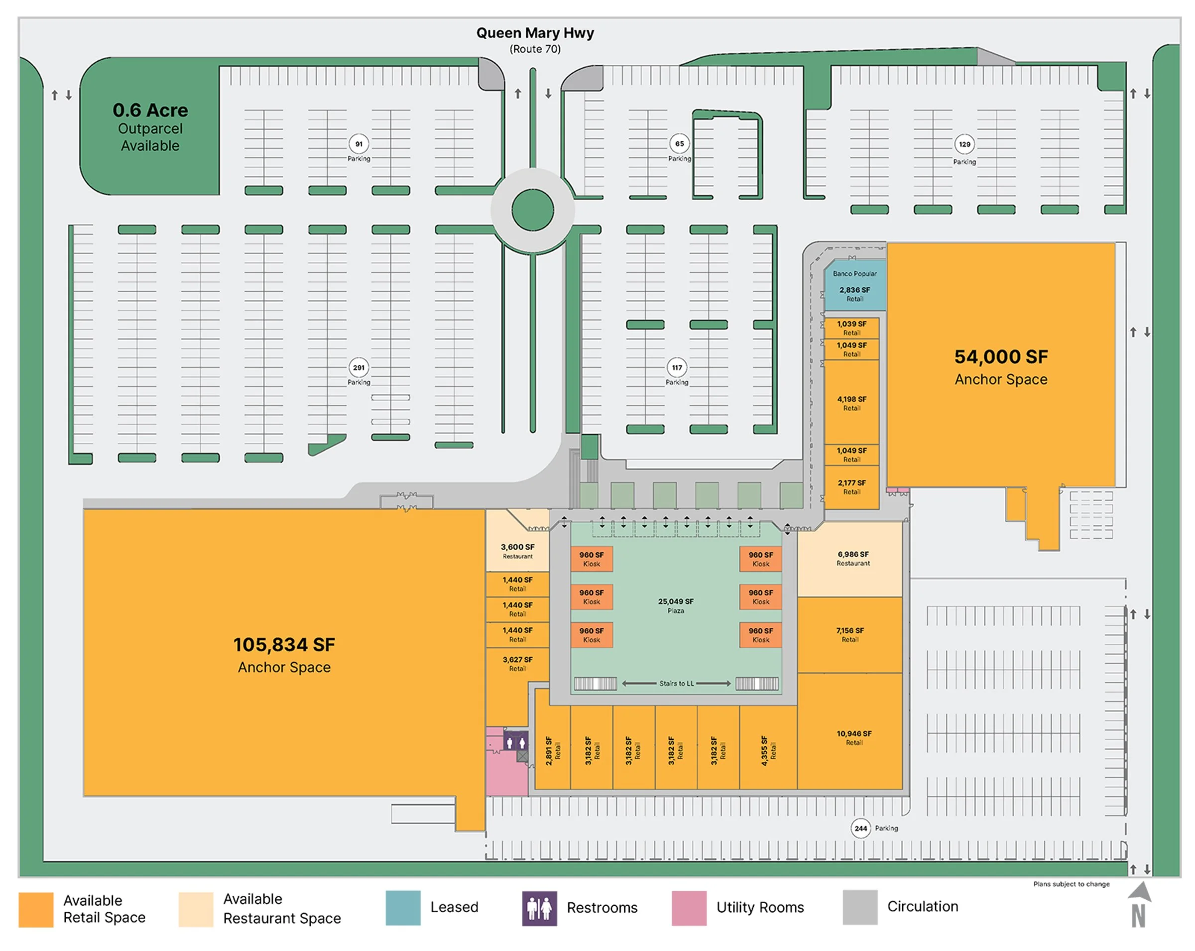 Two anchor spaces are currently available, one at 105,834 SF and one at 54,000 SF.